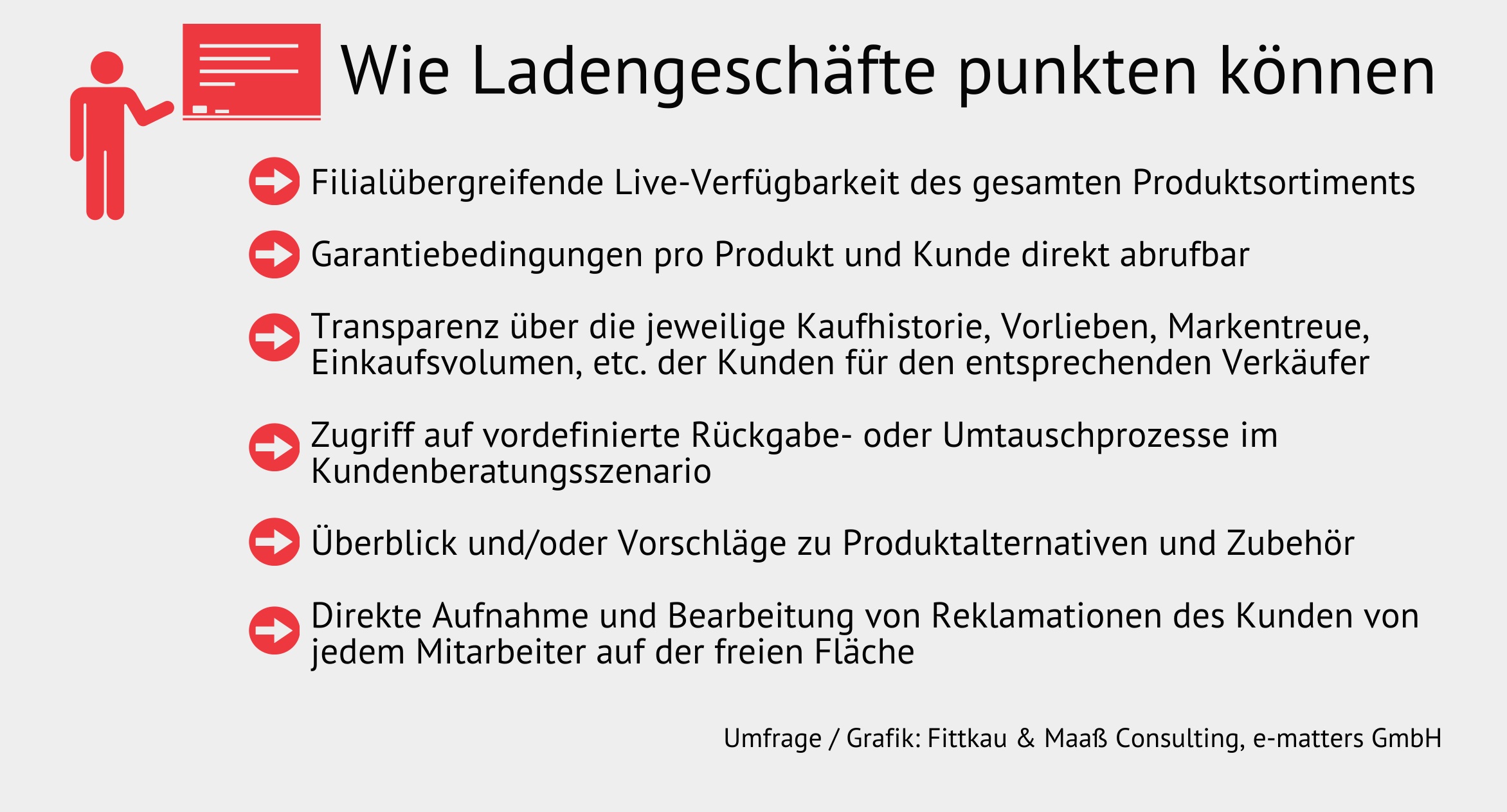 „Aus meiner Sicht sollten stationäre Händler in die ausgestreckte Hand der Internetnutzer einschlagen, die den festen Willen haben, Ladengeschäfte zu nutzen. Neben dem klassischen Vorteil, Produkte direkt vor Ort ausprobieren und sofort mitnehmen zu können, gilt es vor allem den Wunsch nach kompetenter Beratung vor dem Kauf, bzw. effiziente Problemlösung nach dem Kauf zu bedienen.“ erläutert Kevin Besthorn, Geschäftsführer von e-matters. „Voraussetzung dafür ist eine grundsätzliche Bereitschaft des stationären Handels zur Veränderung. Um den hohen Erwartungen und Anforderungen der Kunden gerecht zu werden, müssen Verkäufer stets optimal informiert und in Sachen Service sofort handlungsfähig sein.“