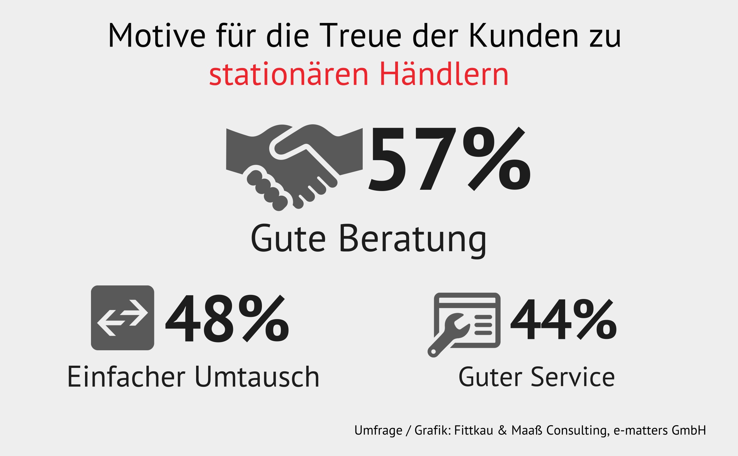 Den Ergebnissen der aktuellen e-matters-Studie »Die Bedeutung von Beratung beim Einkaufen – online und stationär« zufolge ist ein Verkommen stationärer Filialen zu reinen Abholstationen und Showrooms kaum im Sinne der (Online-)Käufer. Die allermeisten Internetnutzer (96 %) kaufen weiterhin bewusst in Ladengeschäften ein und sind dabei bestimmten Händlern treu (88 %).