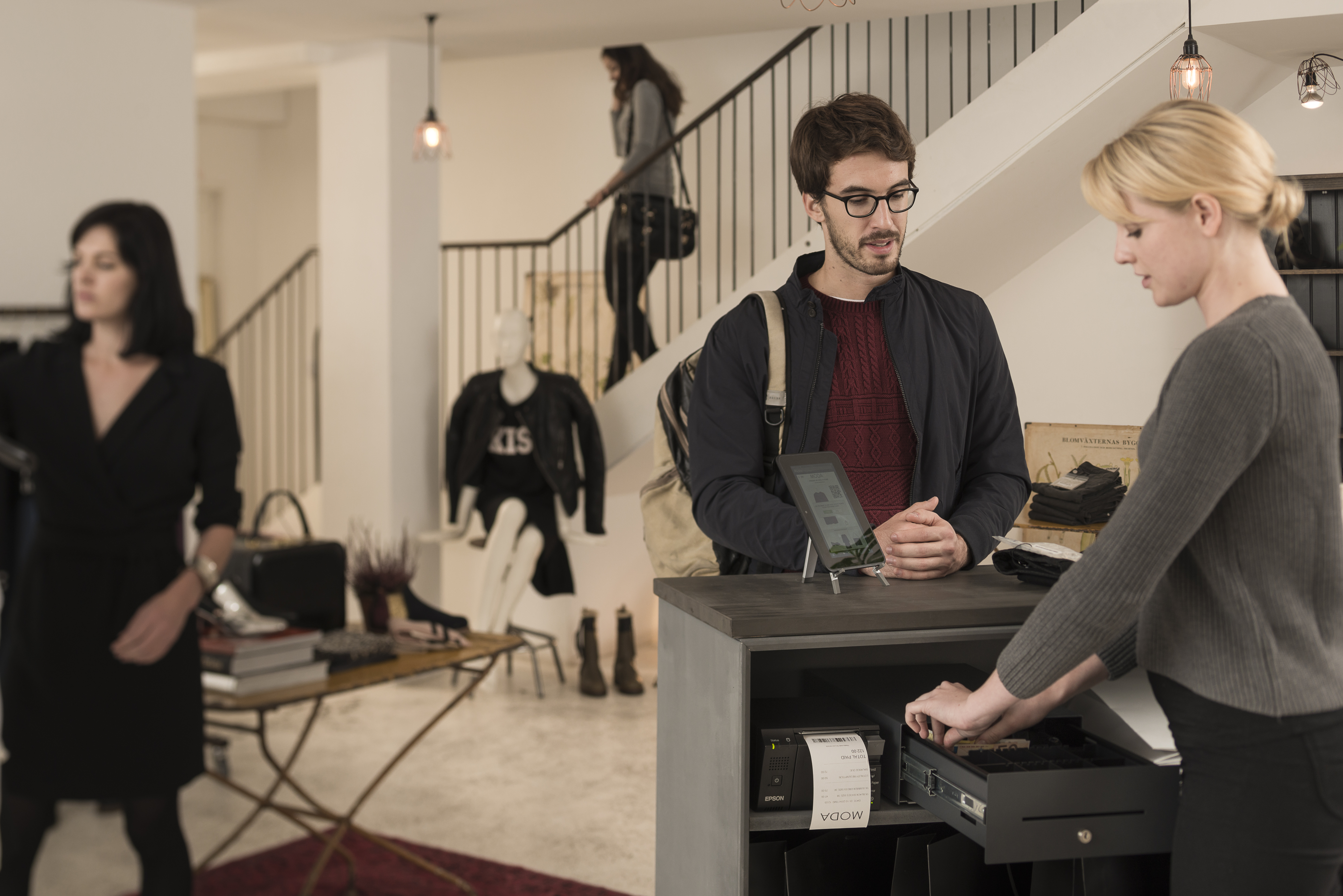 „Spannend wird es erst, wenn der Kunde durch Namenslogin oder Kundenkarte identifiziert wird. Dann kann der Verkäufer über unseren Seller's Co-Pilot per Tablet auf einen Blick Kaufhistorie, Geschmack, Preisniveau, etc. des vor ihm stehenden Kunden sehen. Das ermöglicht ihm eine persönliche Beratung bis hin zum Verkaufsabschluss mit Hilfe unserer webbasierten Kassenlösung“ erläutert Kevin Besthorn, Geschäftsführer von e-matters. Dass die traditionelle Kasse nach wie vor eine wichtige Rolle im Einzelhandel spielen wird ist Besthorn klar: „Gerade deshalb ist uns die Partnerschaft mit Epson wichtig. Wir profitieren von der Expertise von Epson, die die bekannte Kassenschublade verknüpfen mit innovativen Ansätzen wie die intelligenten Bondrucker. Nur so wird der Wandel im Handel Realität, wenn der Kunde und noch viel mehr das Verkaufspersonal Schritt für Schritt neue Verkaufsprozesse einübt.“